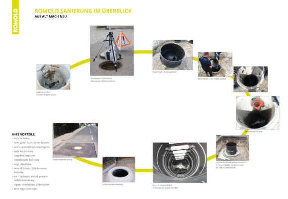 Vorteil: Ein neuer Schacht aus industrieller Fertigung in gewohnter ROMOLD Qualität. Der Clou: Das bestehende Betonbauwerk bleibt als verlorene Schalung im Erdreich. Das spart Zeit und Geld.